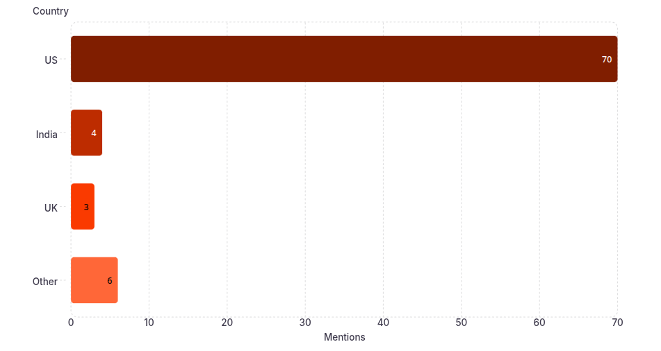 - US: 84.3% (70 mentions) — primary market