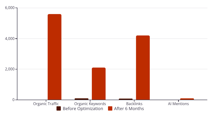 The transformation metrics demonstrate the comprehensive impact of our 6-month optimization strategy for Ultra Soap Direct. These figures are drawn from verified domain overview data reflecting the real growth trajectory achieved across organic traffic, keyword rankings, backlinks, and AI visibility.