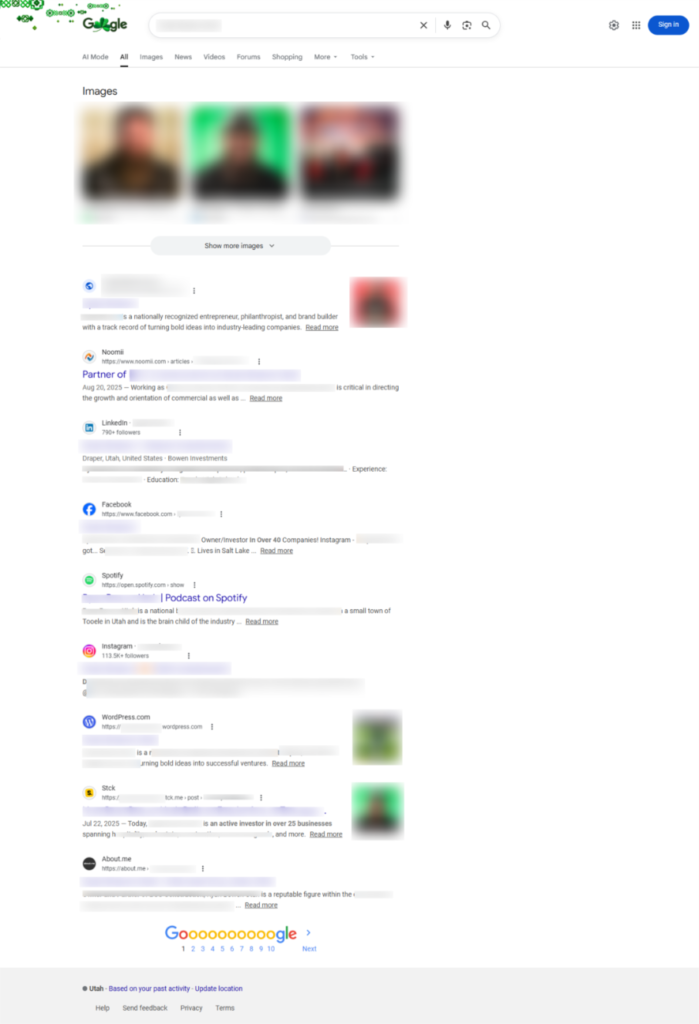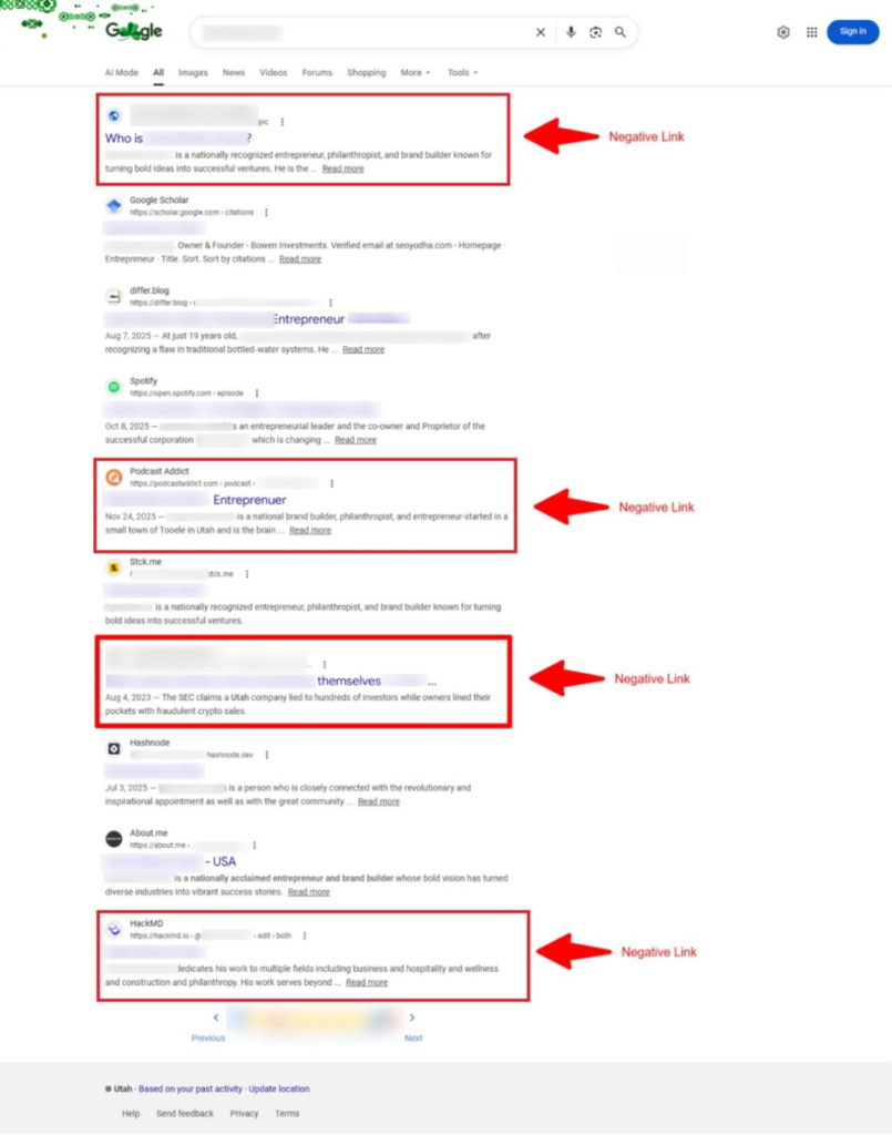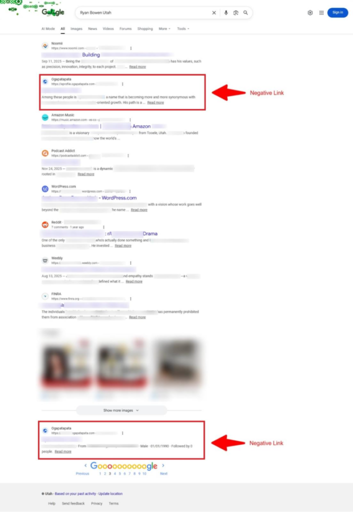 At the start of the project, six negative links were appearing in Google search results for the keyword "Ryan Bowen Utah." These links were affecting the brand perception and creating an unfavorable narrative for anyone researching the entrepreneur online.